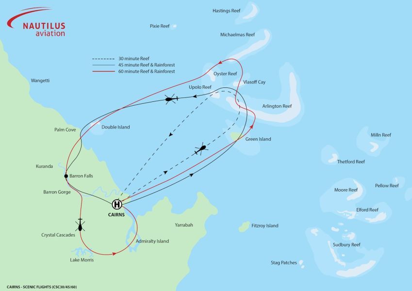 The flight departs from Marina Pint, 2 Pier Point Road, Cairns City.