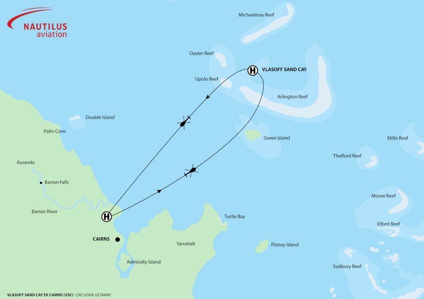 - Vlasoff Cay is a public sand cay and as such can not be reserved. On the rare occasion it is occupied on our arrival we will not be permitted to land. If this occurs passengers will receive an extended reef scenic flight back to the Pier Heliport (total flying time 45 mins including initial 20 mins from Cairns to Vlasoff Cay). Passengers will be able to keep their picnic lunch and our reservations team will advise and assist with any refunds applicable.