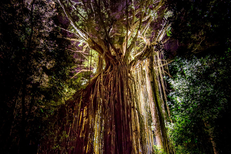 - Spotlighting at the 500 yr old Curtain Fig Tree