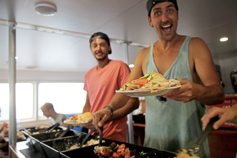 Lunch on board ReefQuest day trips will be a fresh tropical buffet lunch with hot and cold options. If you have any special dietary requirements, please advise us at the time of booking.