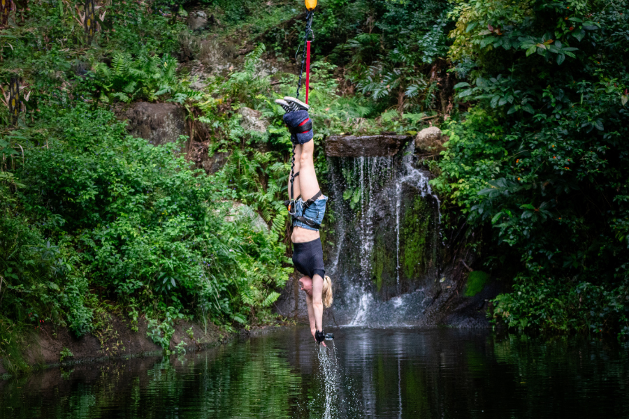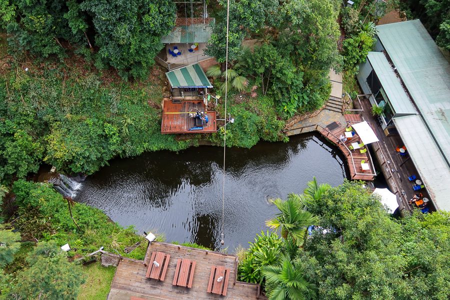 Skypark Cairns by AJ Hackett's Giant Swing is a quick way to travel through the dense tropical rainforest and the mountains of Cairns. Along the way, you will be immersed within the trees and natural waterfall flowing into the pond onsite at the lush oasis. This is perfect way to kick back and relax after getting your thrills jumping from the tower. But it won't be the Swing Master which will set you off on your jump - it will be you who pulls the self release. So when you're ready, take the plunge!