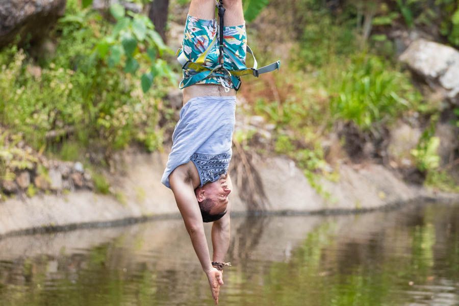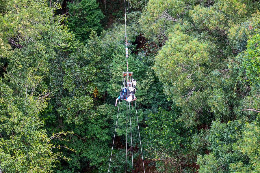 Swingers are fitted into hang-gliding style harnesses and lie horizontally. They are winched up to the release point, where once instructed to do so, you pull a quick-release cord and soar through the rainforest. The Swing is complete once returned to the initial starting point.