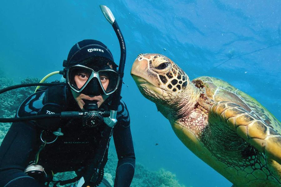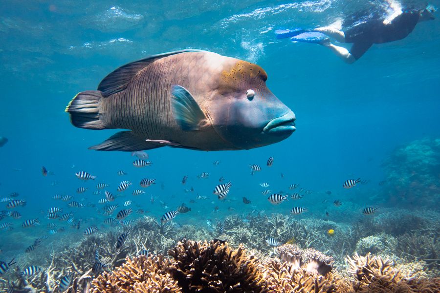 Sea turtles, Maori Wrasse, black and white tip reef sharks, and other tropical fish and corals are commonly spotted at Moore Reef.
