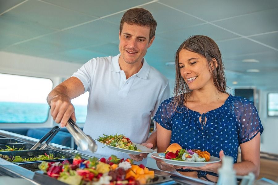 Tusa isn't your ordinary outer reef trip. From the moment you step onboard, every aspect of your day is catered for. On this exclusive, all inclusive reef trip you won't need to worry about anything else. Start the day right with a delicious brekkie spread, cruise on out to the reef and gear up for your first included scuba dive or snorkel of the day! Enjoy a guided snorkel safari with an expert marine biologist, or go solo with state of the art underwater headsets that provide interesting facts about the reef and marine life. Trips are restricted to 40 people only, ages 12 and up to ensure all guests have the ultimate reef experience!