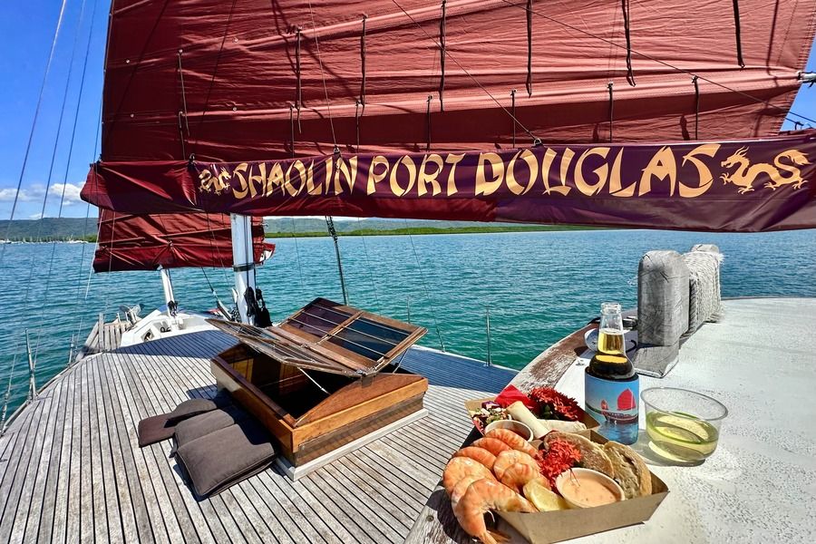 Delight in an amazing lunch onboard Shaolin's traditional Chinese Junk boat from Port Douglas Marina!
